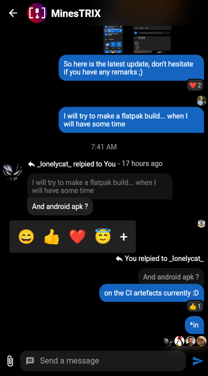 The Matrix Rust SDK team has been busy this week, too. Progress has been made on Siding Sync in particular, the types have been finalised and merged into mainline ruma, and more API has been made accessible via FFI. The new reactive Timeline API has been progressed, it, too, has some FFI definitions now, allowing mobile client to start playing with it. Crypto-JS, too, has progressed, adding support for de/encrypting attachments in an memory efficient fashion. On the crypto-side, the longer on-going refactor and improvements have yielded another few PRs, too, that have successfully merged, while others are still pending reviews. Other than that, we've seen quite a few smaller fixes and improvements, around logging, docs and the examples.